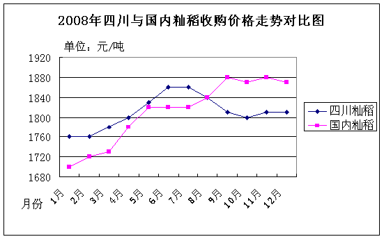 (三)国内及省内籼稻价格整体上扬 纵观2008年国内籼稻市场,整体呈上扬趋势,国内和川内籼稻价格走势有所差异。上半年,受CPI指数持续攀升和国际粮价暴涨的影响,国内及省内籼稻价格持续上涨,国内籼稻从1月的1700元/吨上涨到7月的1820元/吨,上涨了120元/吨,增幅达到7%左右; 川内籼稻收购价格从1月的1760元/吨上涨到7月的1860元/吨,上涨了100元/吨,增幅达到6%左右。下半年,新粮上市后,各类用粮和粮食购销企业看好后市,国内籼稻收购价格冲高到1880元/吨,个别地方达到1960元/吨,10月,国际金融危机的影响进一步加剧,国内籼稻价格出现小幅回落,针对价格下跌的情况,国家及时实施了临时储存稻谷收购计划,累计下达稻谷收购计划2250万吨,及时稳定了稻谷价格;川内籼稻价格小幅下滑,主要原因是金融危机影响加剧和国家对地震灾区实施了“3个月内向灾区困难群众每人每天发放1斤口粮”的政策,灾区对大米的购买量下降,大米销售不旺,在国家出台临时收储政策后,籼稻收购价格回升到1820元/吨左右,并保持平稳运行。