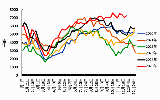 整体来看,阶段性美豆价格缺乏明确指引,预计整体将弱势震荡。在今年弱拉尼娜状态下,南美天气仍存在一定变数,仍需密切关注未来两三个月南美大豆关键生长期的天气变化。 国内丰产压顶,需求能否“接得住”? 2025年国产大豆产量整体延续增长态势,机构预估产量维持在2000万吨以上高位。但由于受不利天气影响,关内大豆产量及品质均有受损,使得东北高蛋白大豆需求上升,农户惜售情绪较浓。 随着原料价格走高,市场对高价豆源接受程度有限,叠加下游大豆原料库存处于高位,现货价格进入僵持阶段。盘面走势更多受市场传言储备大豆拍卖以及自身供需宽松格局影响而有所走弱。 目前,区域间及高低品质大豆价格走势仍延续分化状态,东北产区大豆现货表现偏强,部分贸易主体提价收购,价格较11月底上涨约40元/吨,小型持粮主体惜售情绪有所松动。关内大豆购销相对平淡,一般品质豆源仍积极出货,市场以质论价现象明显。 从需求端来看,进入冬季,豆制品需求将有所提升,但前期市场补库,叠加下游原料库存处于高位,预计需求端提振力度有限。压榨方面,在转基因豆油及豆粕库存充足的背景下,国产大豆压榨需求难有较大增长。 从价格来看,高蛋白大豆较为坚挺,难以流通至压榨厂,关注后续低蛋白大豆价格是否存在进一步下降的空间。 图3:我国大豆周度下游原料库存