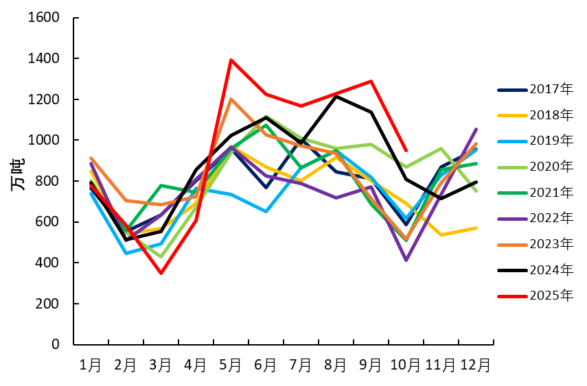 进口大豆方面,由于今年三、四季度进口持续高位,国内大豆及豆粕供应压力仍在消化阶段。11月底国内豆粕库存仍处于百万吨量级,大豆库存也处于近年高位。 需求端,生猪价格持续走弱,养殖利润亏损,肉禽养殖利润也处于盈亏平衡线以下。尽管养殖存栏高位,叠加豆粕性价比较高,饲料刚需表现较好,但在整体大豆供大于需格局下,需求承接力度相对有限。 图4:我国月度大豆进口情况