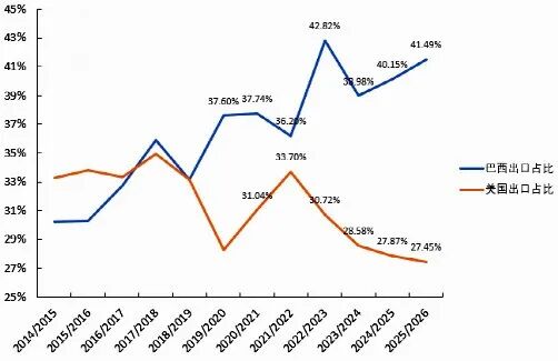 自中美关税协议阶段性落地后,国内外大豆价格走势整体呈现冲高回落态势。 国外方面,芝加哥期货交易所(CBOT)大豆价格仍面临新作出口销售压力,以及南美丰产预期下全球大豆供需宽松的压制,但考虑到其自身供应压力有限,预计美豆价格重心仍有支撑。未来两三个月大豆关键生长期,天气变化仍是关键,高产量能否延续将决定新年度全球大豆供需宽松的程度,而我国对美豆的采购节奏将决定美豆价格重心的反弹空间。 国内市场,关内大豆产区受不利天气影响,品质有所受损,使得东北高蛋白大豆价格支撑较强,阶段性基层惜售情绪较浓。但中长期来看,新季国产大豆丰产格局未变,售粮进度偏慢或导致后续集中销售压力。此外,下游原料库存仍居中高位,需求端承接力度有限,预计大豆价格仍将震荡偏弱。 全球宽松难改,但天气已在“蓄势” 自2022/2023年度全球大豆进入增产周期,供需格局持续转松。11月份美国农业部(USDA)报告显示,2025/2026年度,全球大豆库存预计为1.22亿吨,处于近五年第二高位。 从产量结构来看,由于巴西近年种植面积持续扩张,产量已经突破1.7亿吨,占全球41.5%,对比上一轮中美贸易摩擦期间1.2亿吨的产量提升近40%。 因此,在南美整体供应无实质性转变前,预计全球大豆供需难以出现较大矛盾,对国际大豆价格重心上行空间压制明显。