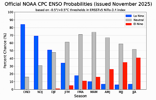 美国大豆:受新作种植面积下滑影响,尽管单产预期居历史高位,但整体供应压力相对有限。出口方面受中美贸易摩擦及近年巴西出口挤占影响,预计难有较好表现。 截至10月底,美豆新作累计出口装船1720万吨,仅完成38.6%。不过,自11月以来中美关税阶段性缓和后,我国已开始采购美国大豆。但在13%的进口关税限制下,更多以政策性进口为主。 根据市场消息统计,目前我国累计采购美豆在500万吨左右,较美国宣称的1200万吨目标仍有较大差距。 此外,近期美国方面表示,年底前采购或以中国农历新年计算,对应CBOT大豆的利多支撑明显减弱。叠加美国生柴政策仍面临不确定性,推迟外国进口原料RINS折算比例以及小型炼油厂再分配方案,使得美豆压榨端缺乏较好驱动。 南美大豆:截至11月29日,巴西大豆新作播种进度86%,大部分区域播种进入尾声;阿根廷大豆新作播种进度44.7%,落后于去年的53.8%。 气候方面,根据NOAA预估,目前拉尼娜现象已出现,预计将持续至2026年2月。拉尼娜往往会造成巴西北部降水偏多,而南部及阿根廷出现干旱现象。 从目前天气预报来看,阿根廷未来两周降水预期偏低,需持续关注后续天气表现。若未来两三个月干旱影响持续,天气升水预计将放大。 图2:模型对ENSO概率预测
