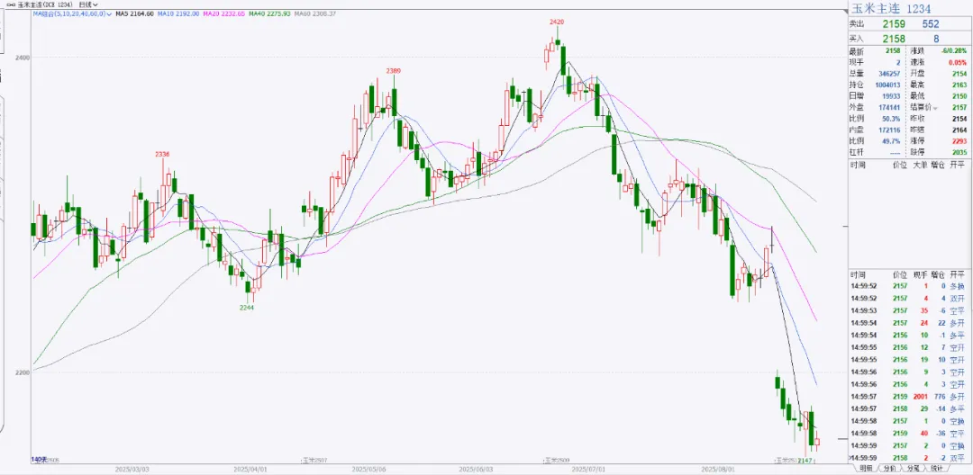 持仓报告显示,当日C2511合约成交量53万余手(较前一日减22.55万手)。多头主力增仓16503手至74.7万手,空头主力增仓21956手至79.7万手。合约增仓下行,资金呈净流入,盘面博弈加剧。