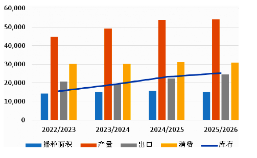 美国农业部(USDA)1月供需报告公布后,芝加哥期货交易所(CBOT)美小麦期货价格低开。本次报告2025/2026年度供需平衡表发生了哪些变动,未来美小麦能否走出弱势?我国托市小麦和储备轮换小麦齐拍,为何国内麦价不跌反涨? USDA1月报告发布后,美麦为何走弱? USDA1月报告中,2025/2026年度美国冬小麦播种面积为3299万英亩,高于市场预估的3141.3万英亩。其中,硬红冬麦播种面积比预期高50万英亩,软红冬麦高近20万英亩。尽管如此,总面积仍然低于2024/2025年度的3315.3万英亩。 图1:美国小麦供需平衡情况(千公顷、千吨)