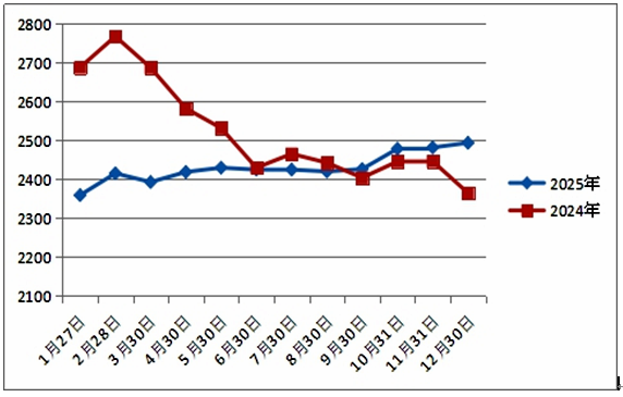 2025年的国内小麦市场,是“政策托底与市场力量”博弈表现较为明显的一年。政策筑牢安全边际,市场机制有效发挥,小麦价格在跌宕起伏、震荡频繁的节奏中“韧性反弹”,市场重心同比出现恢复性上移。预计2026年小麦价格将继续在“上有顶、下有底”的合理区间内运行,市场重心仍有稳步上行的可能,但出现较大异常波动的概率不大。 2025年,国内小麦市场上半年缓慢恢复,小麦均价在1月触及全年低点2388元/吨后,上升至5月底的2429元/吨。但新粮上市后,小麦市场压力逐步加重,各市场主体购销心态谨慎,贸易商和制粉企业做多库存的不多。为遏制小麦价格下跌,国家有关部门先后在五大主产省启动小麦最低收购价执行预案,有效稳定了市场预期,小麦价格基本围绕托市价窄幅波动。四季度小麦市场在震荡反复中韧性反弹,部分地区麦价甚至跨过2600元/吨关口。12月市场虽持续震荡调整,但整体仍盘整于年度阶段高位。 市场监测显示,截至2025年12月底,主产区制粉企业国标二等新普麦进厂价为2480~2550元/吨,较上年同期上涨100~130元/吨,平均涨幅在5%左右,为小麦价格连续两年大幅下滑后恢复性上行。 2025年全国主产区普通小麦均价走势图 单位:元/吨